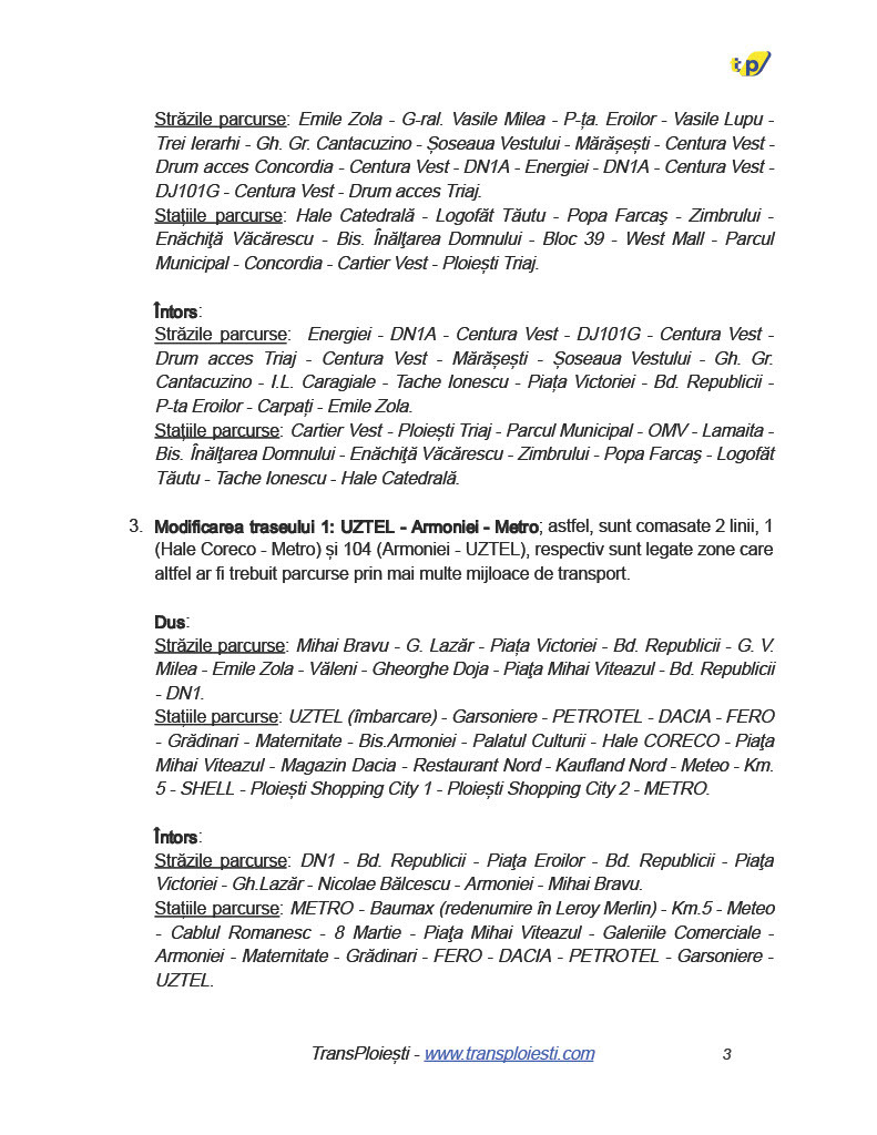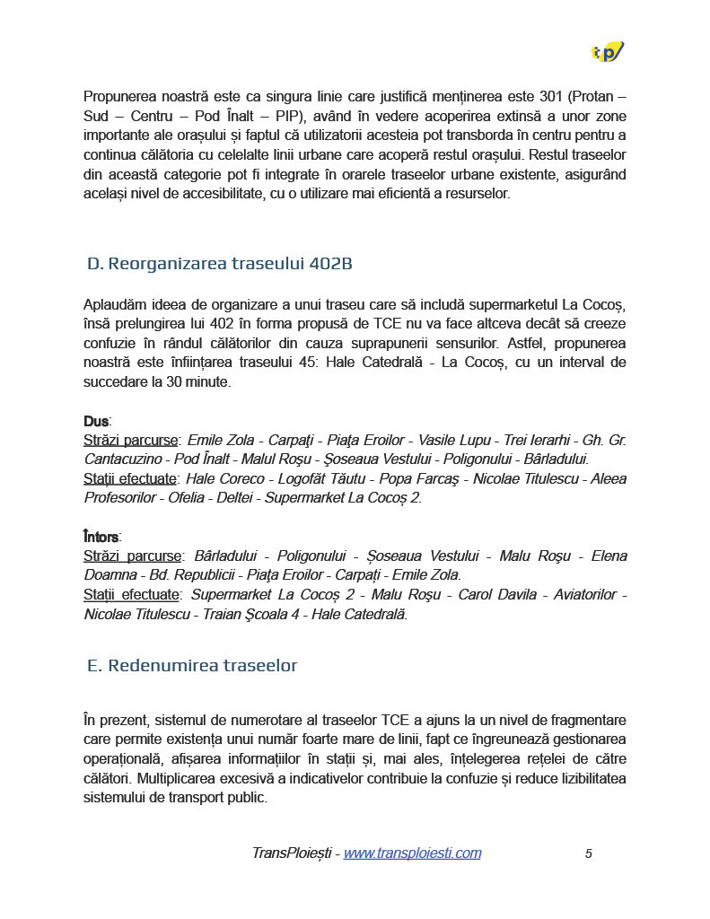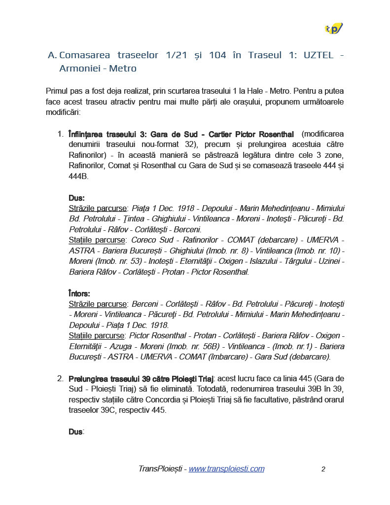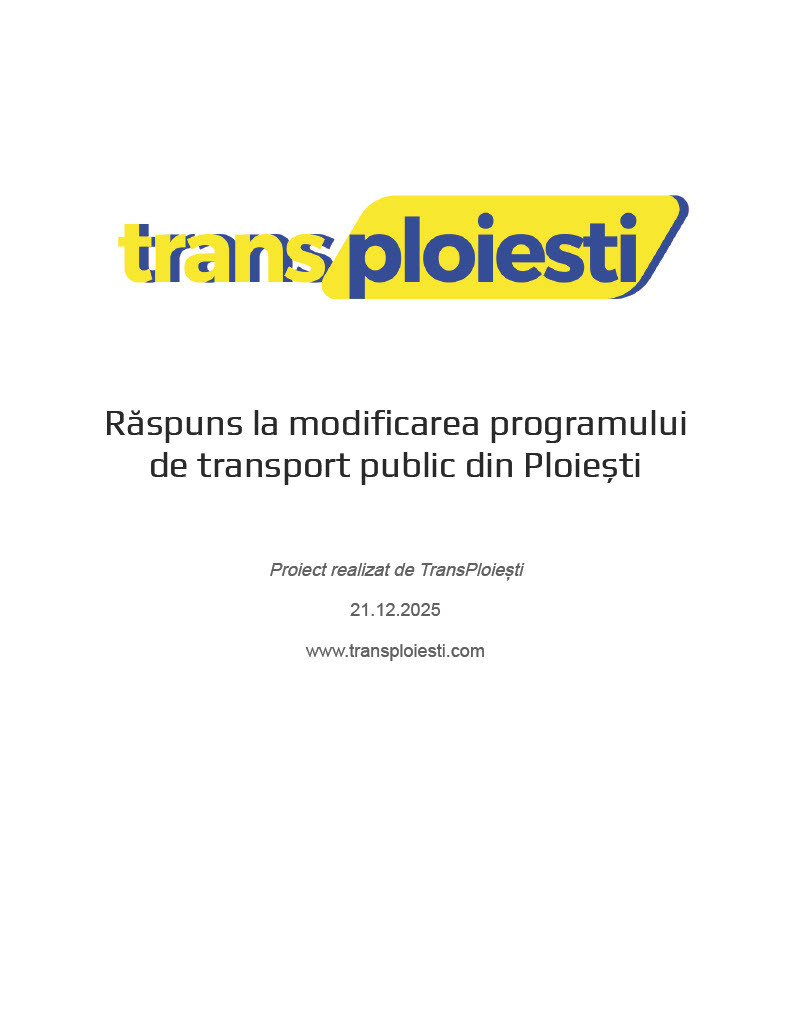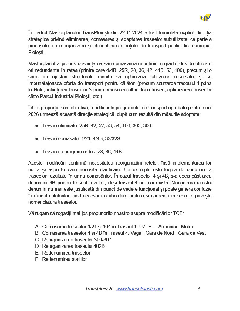Documentul complet, cu analiza detaliată a traseelor eliminate, comasate și propunerile TransPloiești, este disponibil aici, precum și în imaginile de mai jos. Acest document a fost transmis către Primăria Municipiului Ploiești, cât și către S.C. Transport Călători Express S.A. Ploiești. Rămânem deschiși dialogului și considerăm că un transport public funcțional se construiește prin consultare, date și experiența reală a călătorilor.